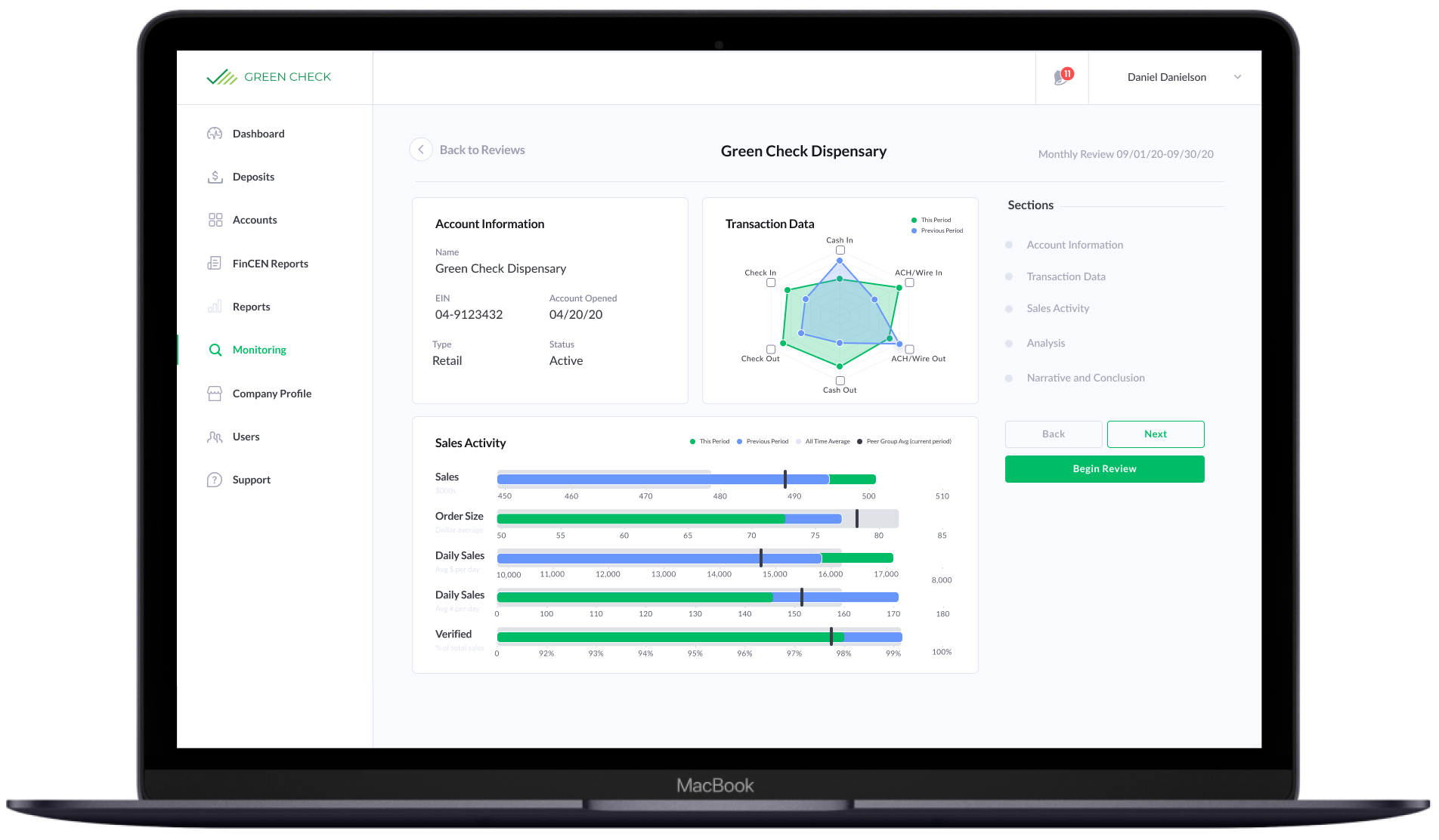 Created by GCV’s team of cannabis banking subject matter experts, including former federal examiners, compliance officers and BSA experts, the new monitoring features let financial institutions leverage their contemporary feed of each accounts’ regulatory, financial and operational data. The result is a deeper understanding of the day-to-day activities of each business, as well as how that activity compares to their peers and against past performance.