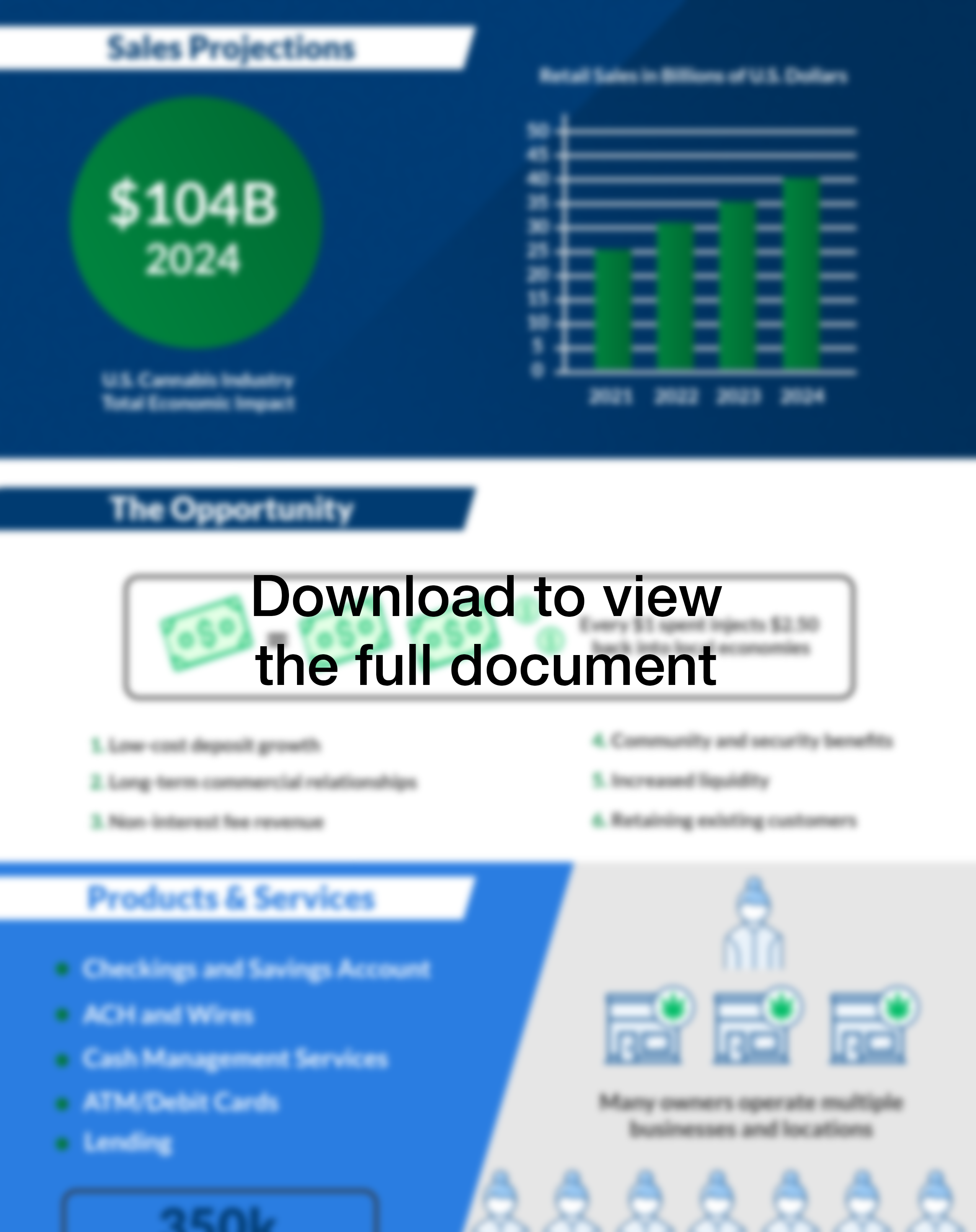 We’ve aggregated the industry’s most important facts and figures to help you build your business case for cannabis banking. Find market stats, sales projections, product & service offering ideas, strategic goal options and average financial performance numbers.